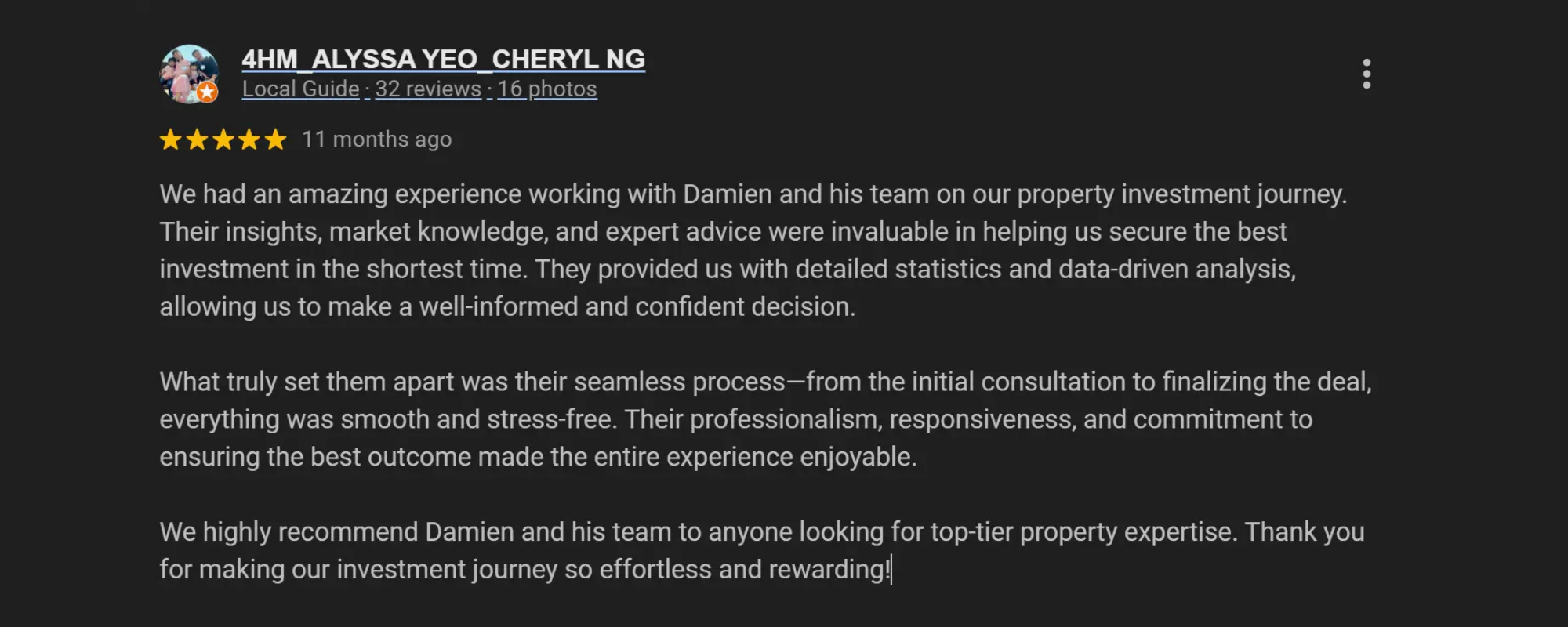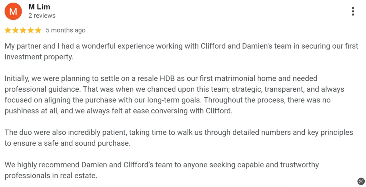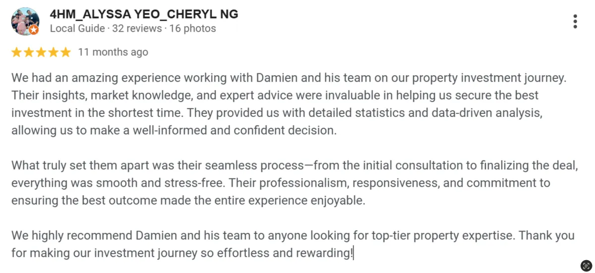 This process of consistently finding winning properties has led us to become one of the best reviewed real estate teams in Singapore.